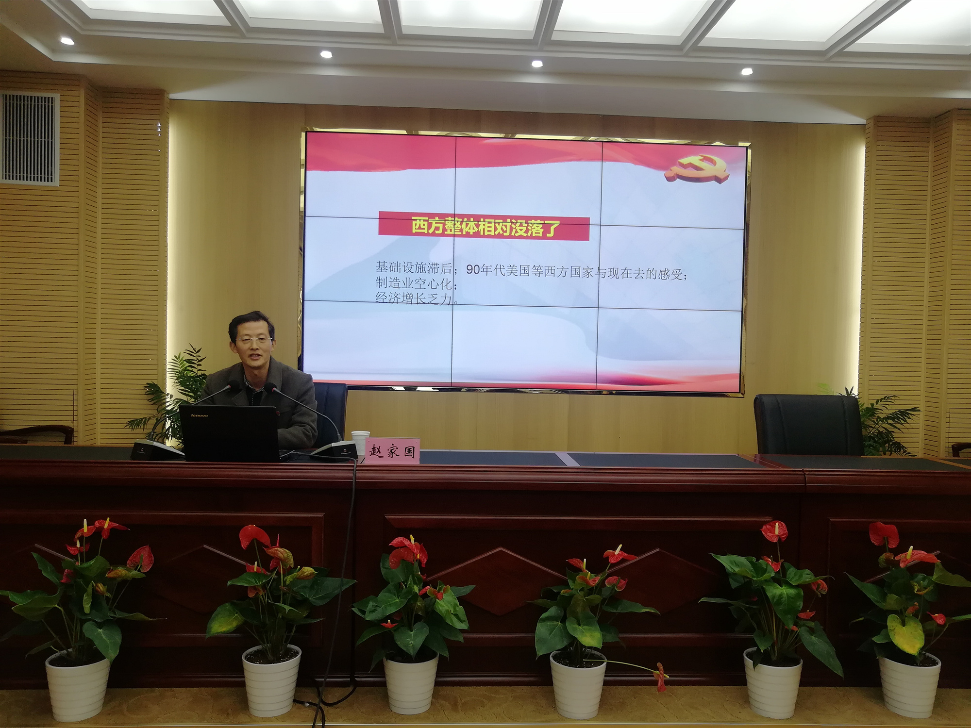 接著,趙家國教授以“12345”為提綱挈領(lǐng),結(jié)合國內(nèi)國外形勢,為大家詳細(xì)解讀了黨的十九屆五中全會(huì)精神的精髓和要義?!?”是一個(gè)重大判斷揭示未來發(fā)展環(huán)境異常復(fù)雜:《建議》提出當(dāng)前和今后一個(gè)時(shí)期,我國發(fā)展仍然處于重要戰(zhàn)略機(jī)遇期,但機(jī)遇和挑戰(zhàn)都有新的發(fā)展變化?!?”是兩個(gè)全局了然于胸謀劃未來:《 建議》指出全黨要統(tǒng)籌中華民族偉大復(fù)興戰(zhàn)略全局和世界百年未有之大變局,深刻認(rèn)識(shí)我國社會(huì)主要矛盾變化帶來的新特征新要求....。我們從這兩個(gè)大局出發(fā)來制定規(guī)劃?!?”是三個(gè)“新”揭示新征程無比豪邁:新階段、新發(fā)展理念、新發(fā)展格局?!?”是四個(gè)首次展現(xiàn)復(fù)興圖強(qiáng)雄心壯志:堅(jiān)持創(chuàng)新在我國現(xiàn)代化建設(shè)全局中的核心地位,首次把全體人民共同富裕取得更為明顯的實(shí)質(zhì)進(jìn)展作為遠(yuǎn)景目標(biāo)提出,首次明確了建成文化強(qiáng)國的具體時(shí)間表,明確提出到2035年建成文化大國,首次提出確保二〇二七年實(shí)現(xiàn)建軍百年奮斗目標(biāo)?!?”是五大原則體現(xiàn)黨的領(lǐng)導(dǎo)更加成熟高超:堅(jiān)持黨的全面領(lǐng)導(dǎo),堅(jiān)持以人民為中心,堅(jiān)持新發(fā)展理念,堅(jiān)持深化改革開放,堅(jiān)持系統(tǒng)觀念。